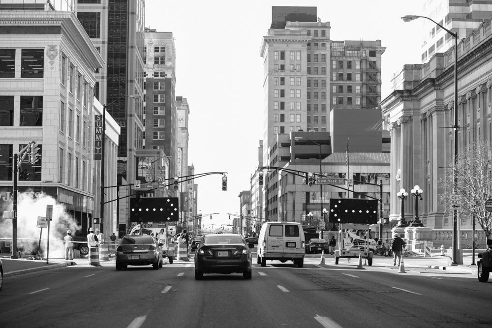 My plan is simply to keep shooting on the streets. It’s harder than it sounds. Indianapolis isn’t a huge city and people notice when I have my camera out. I work hard to capture individuals naturally as opposed to staged shots. I strive to look at the city in different ways and sometimes that requires me to take a step back and reconsider my perspective. For me, it isn’t just walking down the street and making photographs. I think about how I can access rooftops, which alleyways have good light, where people congregate, and which days of the week are busiest. I find that there are certain buildings I’m drawn to for the architecture and favorite bus stops that always have interesting characters. Often, it’s being in the right place at the right time and paying attention. Life is constantly unfolding. For this project, I hope to achieve the flow of the city throughout the day.