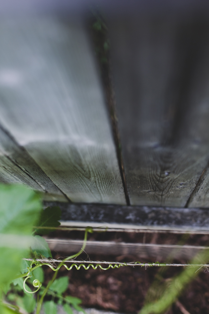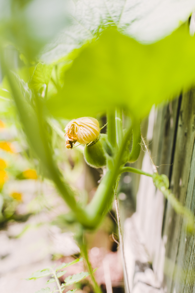 I am in love with this pumpkin. This vine that is now stretched around the perimeter of my garden for almost 30 feet! After Thanksgiving my Uncle gave me this amazing green he’d bought for decoration, because he thought I’d enjoy shooting it. Of course I did! It was featured in my daily photo project and then I photographed before, during and after we cut it up to eat. It was enormous, delicious and I saved some seeds for growing. I’d tried to start a plant indoors but nothing happened. I was sure the seed had molded or was a dud so once spring rolled around, I just dumped the soil in the garden. A few weeks later it miraculously germinated and started growing the most magnificent plant. I’ve never been able to grow squash back there despite years of trying – the plants usually die a slow death from powdery mildew. But this year, with the delayed summer and few humid-stricken heat waves – not to mention that I’m treating it with organic fungicide – I’m having success. Sadly, this is the only pumpkin that’s growing. The others either yellowed and died or were eaten by a raccoon, squirrel or possum.